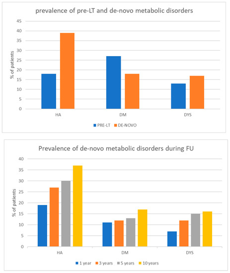 An increase in body weight, arterial hypertension, and serum glucose levels at 6 months have been reported as predictors of metabolic syndrome after LT [15]. Furthermore, metabolic disorders may also favor cardiovascular diseases, increasing cardiovascular mortality in the long term after LT [16].