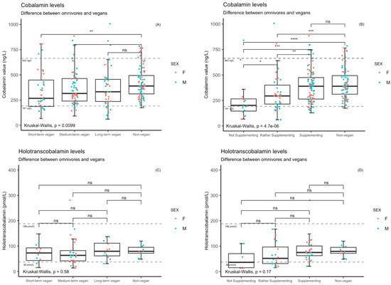 (A,B) Cobalamin levels stratified by the duration of vegan diet (compared to non-vegans); Cobalamin levels based on the supplementation habit (compared to non-vegans). Dashed lines indicated the reference interval of the marker. The coding of statistical significance: <0.0001 = ****, 0.0001–0.001 = ***, 0.001–0.01 = **, 0.01–0.05 = *, 0.05–1 = ns (non-significant). (C,D) Holotranscobalamin levels stratified by the duration of vegan diet (compared to non-vegans) and without showing the outlier values (2 male supplementing vegans holotranscobalamin = 682 and 521 pmol/L. The p values are calculated from all observations.) to visualize the major difference between groups; Holotranscobalamin levels based on the supplementation habit (compared to non-vegans)) and without the outlier values to visualize the major difference between groups. Dashed lines indicated the reference interval of the marker. The coding of statistical significance: <0.0001 = ****, 0.0001–0.001 = ***, 0.001–0.01 = **, 0.01–0.05 = *, 0.05–1, ns = non-significant.