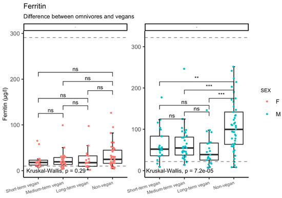 Ferritin levels, the stratification based on duration of vegan diet (compared to non-vegans) and based on sex. Dashed lines indicated the reference interval of the marker. The coding of statistical significance: 0.0001–0.001 = ***, 0.001–0.01 = **, 0.05–1 = ns (non-significant).