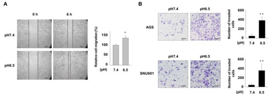 Acidic culture conditions increase migration and invasion of gastric cancer (GC) cells. (A) AGS cells were maintained in normal (pH 7.4) or acidic (pH 6.5) medium, and migration of the cells was assessed by using a wound healing assay at 6 h after scratch. (B) Invasion of cells cultured in normal or acidic medium was assessed by a matrigel-coated transwell assay. After 6 h for AGS and 18 h for SNU601, invaded cells were detected under a microscope (left) and the number of invaded cells was counted (right). * p < 0.05, ** p < 0.01 vs. pH 7.4. Scale bar = 100 μm.
