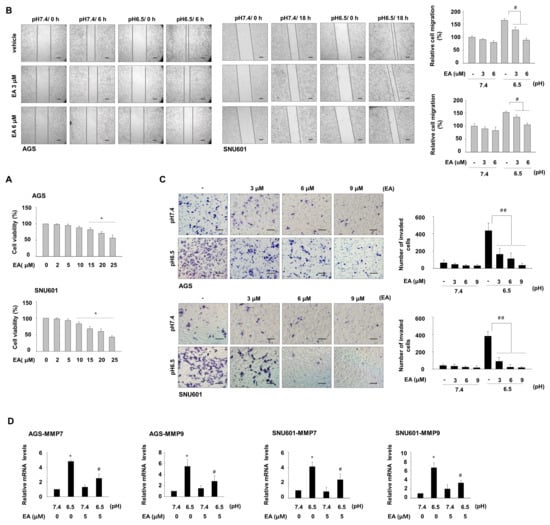 Ellagic acid inhibits acidity-enhanced cell migration and invasion. (A) AGS and SNU601 cells were treated with the indicated concentrations of ellagic acid for 48 h, and cell viability was assessed by the EZ-cytox assay. * p <0.05 vs. no treatment. (B) Cells maintained in normal or acidic medium were further exposed to ellagic acid for 24 h. Then, cell surface was scraped, and migrated cells were detected under microscope (left). Quantitative data are shown (right). (C) Cells maintained in normal pH or acidic pH were further incubated at the indicated concentrations of ellagic acid for 24 h; invasion ability was assessed by invasion assay using matrigel-coated transwell system. After 6 h for AGS and 18 h for SNU601, invaded cells were detected under a microscope (left) and the number of invaded cells was counted (right). # p < 0.05, ## p < 0.01 vs. no ellagic acid at pH 6.5. (D) Cells cultured in normal or acidic growth medium were further incubated for 24 h without or with ellagic acid. The cells were then harvested, and mRNA expression of the genes encoding MMP7 and MMP9 was analyzed by real-time PCR. * p < 0.05 vs. no treated control at pH 7.4; # p < 0.05 vs. no ellagic acid at pH 6.5. Scale bar = 100 μm.