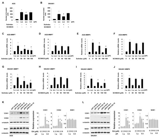 Ellagic acid inhibits expression of COX1 and COX2, which are involved in acidity-enhanced invasion. (A,B) AGS and SNU601 cells maintained in acidic medium were treated with 100 μM sulindac or 30 μM SC58635 for 24 h. Then, the number of invaded cells was counted. (C–J) AGS (C–F) and SNU601 (G–J) cells maintained in acidic medium were treated with sulindac (C, E,G,I) or SC58635 (D,F,H,J) for 24 h. The mRNA expression of the genes encoding MMP7 (C,D,G,H) and MMP9 (E,F,I,J) was subsequently analyzed by real-time PCR. (K,L) AGS (K) and SNU601 (L) cells maintained in normal or acidic medium were further incubated for 24 h with or without ellagic acid. Then, total protein extracts were analyzed by immunoblotting with antibodies against COX1, COX2, and NHE1 (left), and densitometry calculations for immunoblotting data are shown (right). * p < 0.05 vs. no treated control at pH 7.4; # p < 0.05 vs. no ellagic acid at pH 6.5.