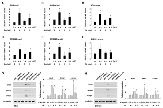 Ellagic acid suppresses acidity-mediated expression of snail, twist1, and c-myc. (A–F) AGS (A–C) and SNU601 (D–F) cells cultured in normal or acidic growth medium were further incubated for 24 h without or with 5 μM ellagic acid. Then, mRNA expression of the genes encoding snail (A,D), twist1 (B,E), and c-myc (C,F) was analyzed with real-time PCR. * p < 0.05 vs. no treated pH 7.4; # p < 0.05 vs. no treated pH 6.5. (G,H) AGS (G) and SNU601 (H) cells cultured in normal or acidic growth medium were further incubated for 24 h without or with ellagic acid, then total protein extracts were analyzed by immunoblotting with antibodies against snail, twist1, and c-myc (left). Densitometry calculations for immunoblotting data are shown (right). * p < 0.05 vs. no treated control at pH 7.4; # p < 0.05 vs. no ellagic acid at pH 6.5.