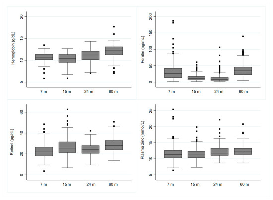 The current analysis evaluated factors associated with the deficiencies of zinc, vitamin A, and iron, as well as anemia from seven months to five years of age and also aimed to identify whether distinct trajectories of micronutrient concentrations from 7 to 24 months predict micronutrient status at 60 months of age.