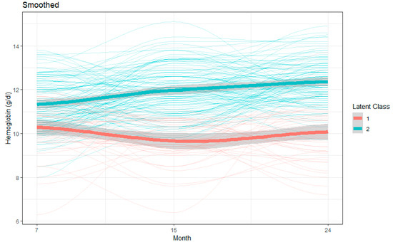 Based on the criteria described in the Statistical Analysis Section (BIC, log Bayes factor approximation), the difference in the population distribution of the progression of hemoglobin concentration was best characterized by a two-class model with quadratic components for both trajectories. Group 1 indicated an overall decreasing pattern over the months with mean hemoglobin concentrations of 10.31 g/dL, 9.78 g/dL, and 10.16 g/dL at 7, 15, and 24 months, respectively, while Group 2 indicated an overall increasing pattern with mean hemoglobin concentrations of 11.36 g/dL, 11.83 g/dL, and 12.36 g/dL at 7, 15, and 24 months, respectively (Table 4 and Figure 2).