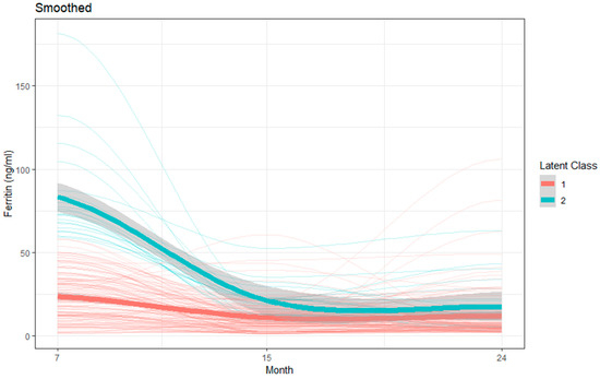 For ferritin, a two-class model with quadratic components for both trajectories was retained as the final and most parsimonious model. Mean ferritin concentration for the children belonging to Group 1 showed an overall lower value over the months, whereas Group 2 had higher mean values. Mean ferritin concentration in Group 1 was 24.2 ng/mL, 13.19 ng/mL, and 13.99 ng/mL, and in Group 2 was 82.97 ng/mL, 21.18 ng/mL, and 18.21 ng/mL at 7, 15, and 24 months, respectively (Table 4 and Figure 3).