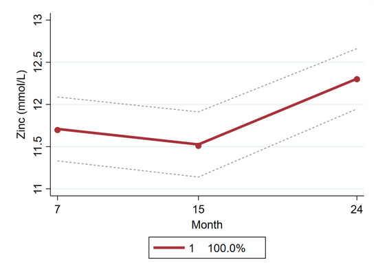 In contrast, a one-trajectory model with a quadratic component was retained as the final model for zinc. The more complex models with two, three, or four trajectories generated trajectories with insufficient cluster size (less than 5% of the study population). This result indicates that no significant distinct classes existed in the population for the progression of concentration of plasma zinc and all individuals followed a similar pattern over the months. Mean zinc concentration among the children included in the analysis was 11.71 mmol/L, 11.53 mmol/L, and 12.3 mmol/L at 7, 15, and 24 months, respectively (Table 4 and Figure 5).