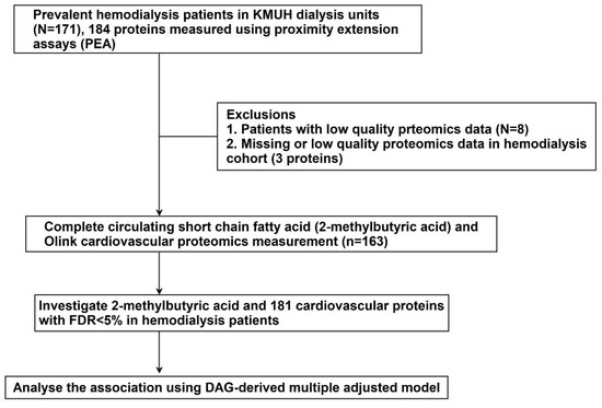 In total, 171 HD patients were enrolled for the measurement of nine SCFAs by HPLC and 184 CV-specific proteins by proximity extension assays. After quality control of SCFA data, lactic acid and 2-methylbutyric acid were the major SCFAs detected in blood samples of HD patients. However, exogenous lactic acid formed by lactic acid bacteria enters the blood compartment and is mixed with endogenous lactic acid released by tissues and organs. Thus, we mainly investigate 2-methylbutyric acid because our study aim was focused on gut-produced SCFAs. In addition, subjects with low-quality proteomics data (n = 8) were excluded. Three proteins were excluded because of low-quality proteomics data. Finally, the association between 2-methylbutyric acid and 181 CV cascade proteins was analyzed in 163 HD patients (Figure 1).
