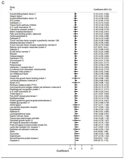 The association between 2-methylbutyric acid and 181 cardiovascular proteins in linear regression models with age and sex adjustment. (A) protein 1–62 (B) protein 63–123 (C) protein 124–181.