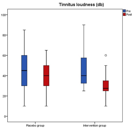 Tinnitus loudness (db) is displayed as box plots for each group at baseline and at follow-up. The line inside the box represents the median and the box portion of the box plot is defined by two lines at the 25th percentile and 75th percentile. Circles denote outliers.