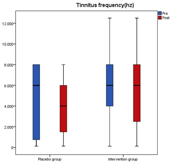 Tinnitus frequency (Hz) is displayed as box plots for each group at baseline and at follow-up. The line inside the box represents the median and the box portion of the box plot is defined by two lines at the 25th percentile and 75th percentile.