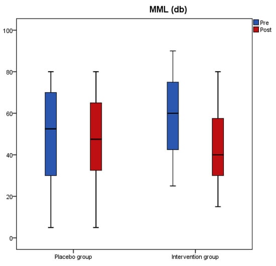 MML (db) is displayed as box plots for each group at baseline and at follow-up. The line inside the box represents the median and the box portion of the box plot is defined by two lines at the 25th percentile and 75th percentile.