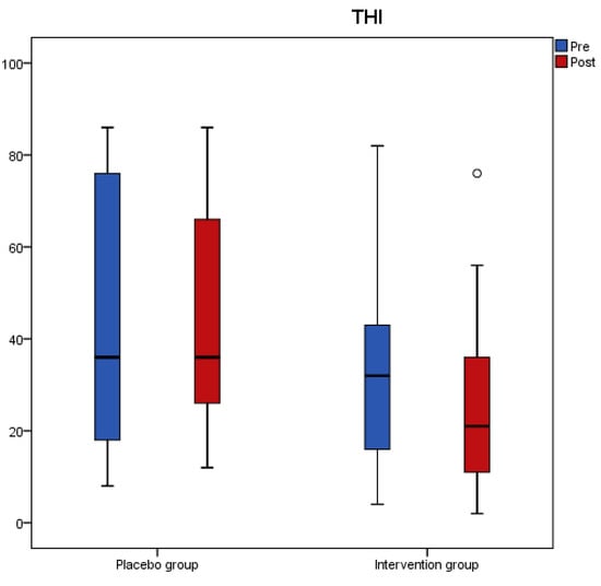THI is displayed as box plots for each group at baseline and at follow-up. The line inside the box represents the median and the box portion of the box plot is defined by two lines at the 25th percentile and 75th percentile. Circles denote outliers.