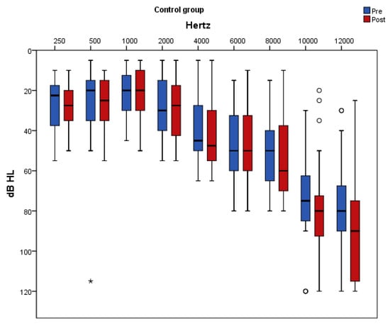 Pure-tone thresholds in the frequency range from 250 to 12,000 Hz (dB HL) are displayed as box plots for each frequency in the placebo group at baseline and at follow-up. The line inside the box represents the median and the box portion of the box plot is defined by two lines at the 25th percentile and 75th percentile. Circles denote outliers and asterisks denote extreme values.