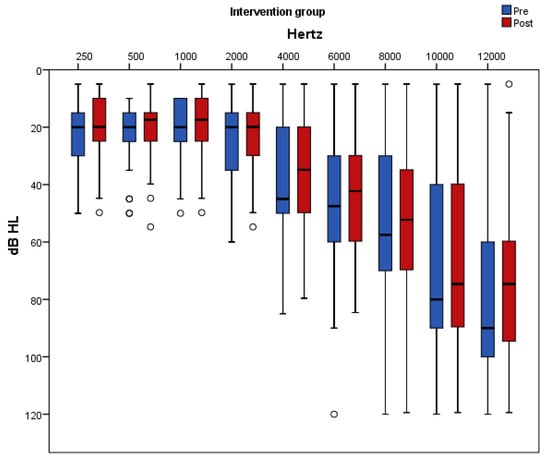 Figure 5 and Figure 6 present pure-tone thresholds in the frequency range from 250 to 12,000 Hz (dB HL) as box plots for each frequency at baseline and at follow-up in the placebo and antioxidant group accordingly. The degree of change in the PTA thresholds at the frequencies of 250 Hz, 2000 Hz, 4000 Hz, 10,000 Hz, and 12,000 Hz differed significantly between the two groups. Specifically, at the frequencies of 250 Hz, 500 Hz, 1000 Hz, 2000 Hz, and 6000 Hz there was a significant decrease in the auditory threshold only in the antioxidant group whereas in the placebo group there was no significant change post intervention. At the frequency of 10,000 Hz there was a significant increase only in the placebo group while in the antioxidant group there was no significant change after the intervention. At the frequencies of 4000 Hz and 12,000 Hz there was a significant decrease in the antioxidant group and a significant increase in the placebo group.
