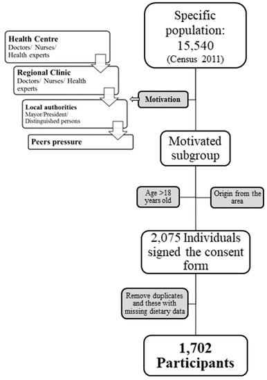 We contacted the local Health Centre in Echinos and, with the cooperation of the local doctors and nurses, a total of 1702 volunteers were recruited between July 2010 and March 2013. The recruitment flowchart is summarized in Figure 1. The Bioethics Committee of Harokopio University of Athens approved the study protocol and all subjects signed a voluntary informed consent form, according to the standards of the World Medical Association’s Declaration of Helsinki for ethical principles for medical research involving human subjects. All participants were interviewed by trained personnel using a standardized questionnaire. The questionnaire included clinical assessment and anthropometric measurements, as well as questions on demographic and lifestyle characteristics, detailed self-reported medical history, physical activity, and dietary habits. The medical history and corresponding medication were cross-checked by trained clinicians.