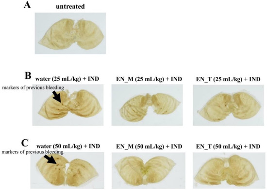 Observations of formalin-fixed stomachs 6 h after oral IND administration revealed more markers of previous bleeding in the water + IND group than in the untreated group (Figure 3A–C). In contrast, few markers of previous bleeding were noted in the groups orally given 25 or 50 mL/kg of EN_M or EN_T 30 min before oral IND administration (EN_M + IND group and EN_T + IND group, respectively) (Figure 3B,C). Stomachs of the animals that received 50 mL/kg of EN_M or EN_T tended to have fewer markers of previous bleeding than those of animals receiving 25 mL/kg (Figure 3B,C).