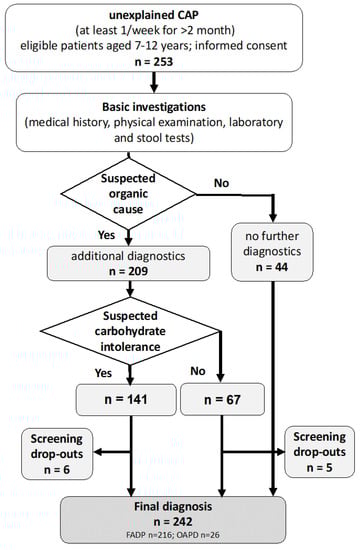 At the end of the diagnostic assessment, the attending pediatric gastroenterologist determined the final diagnosis and leading cause of CAP on the basis of the medical screening (including additional diagnostics) and response to treatment or dietary intervention (including elimination and provocation), which corresponds to other research approaches [,]. Functional abdominal pain disorders (FAPD) were diagnosed in children using the Rome III criteria, as Rome IV was only released later on during the study [,,]. Children with carbohydrate malabsorption reporting symptom relief during open-label elimination of the respective carbohydrate at follow-up were classified as intolerant and assigned to the organic abdominal pain disorder (OAPD) group. The persistence of abdominal pain at least once per week during the elimination diet without evidence for organic disease was classified as predominant FAPD. All patients with proven organic gastrointestinal disease were classified as having organic abdominal pain disease (OAPD).