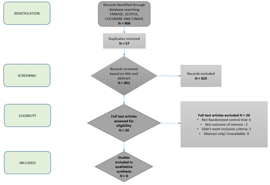 A total of 908 studies were identified by our expert medical librarian, C.S. After title review by two independent authors, fifty-seven duplicates were removed, leaving 851 unique articles (Figure 1). On the basis of abstract review, 26 were selected for full-text review. Two study authors classified six articles as meeting the predefined criteria for analysis [17,22,23,24,25,26]. A total of 317 patients from six unique populations were represented. Five out of the six studies assessed the effects of the Mediterranean diet (MD), and the remaining study assessed modified alternate-day calorie restriction (MACR, a type of intermittent fasting (IF) diet). Comparison dietary interventions included low fat, low carbohydrate, and usual care. Hepatic steatosis (%) was measured with magnetic resonance spectroscopy (MRS) or ultrasound (US) in 5/6 studies. Liver stiffness was measured using shear wave elastography in 4/6 studies.