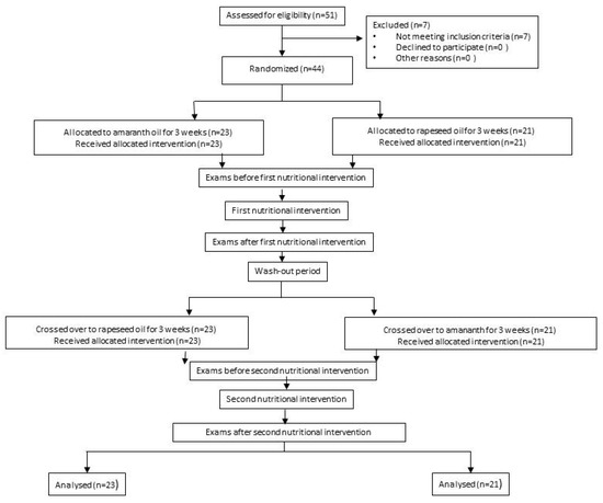 On entry, all participants were randomly assigned to one of the arms. In arm I, the subjects were asked to administer 20 mL of AmO per day in the first nutritional intervention and 20 mL of RaO per day in the second nutritional intervention; in arm II, participants received 20 mL of RaO per day in the first nutritional intervention and 20 mL of AmO per day in the second nutritional intervention. The first and second nutritional interventions were separated by a three-week washout period. The investigators and participants were blinded from the computer-generated randomization codes until the end of all data analysis.