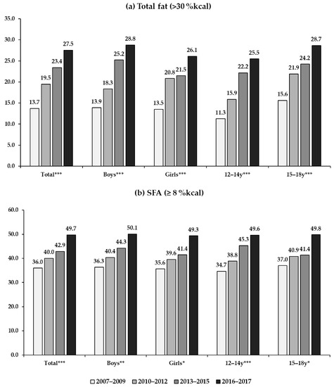 Trends in proportions of subjects who had more than the dietary guidelines for total fat and saturated fatty acids (SFA) among Korean adolescents during 2007–2017: (a) total fat; (b) SFA. (a) The statistical analysis accounted for the complex sampling-design effect and used appropriate sample weights. (b) p trends were obtained from the chi-square test to examine differences in proportions across the survey period. * < 0.01, ** < 0.001, *** < 0.0001.