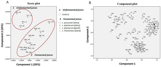 Cherry juice is recognized to be a stressful substrate for microorganisms, due to its low pH, its high sugar and phenolic content, and the presence of malic acid [23]. This unfavorable environment affects the growth and cell viability of most tested strains, with a particular negative effect on L. casei and L. rhamnosus, which were not able to grow satisfactorily in this medium. On the contrary, all L. plantarum strains, both of dairy and plant origin, showed a good adaptability. Moreover, L. rhamnosus 2360 and L. paracasei 4186 were also able to ferment cherry juice components and to survive during refrigerated storage, also offering the possibility of conveying viable cells of non-plant origin in this fruit juice. PCA analysis showed a clear separation between unfermented and fermented juices, on account of the significant modulation of the composition of the juice matrix by lactic acid fermentation.