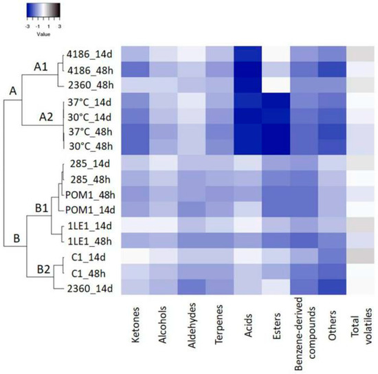 Figure 3. Volatile profile. Hierarchical clustering and heat map performed on sugars and organic acids detected in fermented cherry juice with L. plantarum (C1, 1LE1, POM1 and 285), L. rhamnosus (2360) and L. paracasei (4186) and in unfermented juice (30 °C and 37 °C) after 48 h and 14 days (storage). A scale ranging from a maximum of 3 (black) and a minimum of −3 (blue) was used.