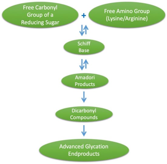 Advanced glycation end products (AGEs) is a term used to describe a heterogeneous group of compounds that are formed through a series of nonenzymatic reactions, together termed the Maillard reaction, involving an amino acid with a free amino group (such as lysine or arginine) and a free carbonyl group of a reducing sugar. This initial amine–carbonyl reaction results in an imine, often referred to as a Schiff base, which undergoes rearrangement to form an intermediate glycation product, the Amadori product, which is a more stable α-ketoamine. These Schiff bases and Amadori products are initial glycation products, and at this stage are reversible. Amadori products can also undergo degradation to form dicarbonyl compounds, such as methylglyoxal (MG), and then undergo further degradation, oxidation, reduction and condensation reactions, leading to irreversible AGE formation [1], as illustrated in Figure 1. Major AGEs present in vivo or from exogenous sources include methylglyoxal–hydroimidazalone (MG-H1), carboxymethyl–lysine (CML), carboxyethyl–lysine (CEL), pentosidine and pyrraline [2]. Given the heterogeneity of AGEs formed, it is often difficult to fully quantify their formation, and subsequently CML, CEL and pentosidine are commonly used as biomarkers for the glycation process [3]. Furthermore, the heterogeneity of AGEs formed during the heat treatment of foods is greater than that of those formed physiologically, and the diversity of dietary AGEs has hindered efforts to study their effects [4]. It should be noted that the AGE pyrraline is formed exclusively within food products and thus measuring pyrraline may provide a better indicator of the effects of AGEs of exclusively dietary origin [5]. The objective of this review is to describe the food sources, absorption and health effects of dietary AGEs and provide a summary of in vitro and in vivo studies that have provided high AGE intervention and assessed the composition of the gut microbiome.