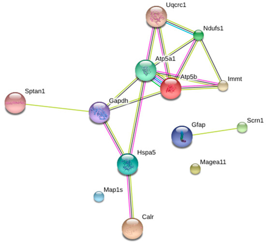Figure 3 shows a classification according to the protein–protein interactions of brain proteins differentially expressed after the starvation period. This is the classification provided by the STRING software, considering only the first 5 categories. Within the clusters: biological processes, molecular functions, cellular components, and KEGG (Kyoto Encyclopedia of Genes and Genomes) routes, we found proteins that were included in several groups simultaneously. MAP1S is also included in this classification, although this protein does not interact with any of the other proteins. Of special interest was the classification of “KEGG routes”, where the proteins ATP5A1, ATP5B, NDUFS1, and UQCRC1 participate in both oxidative phosphorylation and diseases such as Parkinson’s, Alzheimer’s, and Huntington’s.