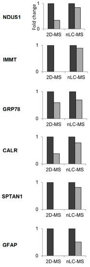 The 2D-MS data were validated by quantifying the fold change detected in selected proteins using a nLC-MS proteomics procedure. As shown in Figure 4, the protein-expression level from NDUS1, IMMT, GRP78, CALR, SPTAN1, and GFAP fell after long-term starvation. The resulting protein-expression patterns were consistent with those found by 2D-MS analysis, confirming the results reached with this procedure.