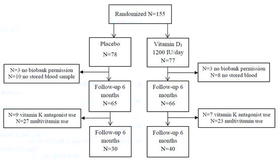 Flow chart of randomization. Due to combined use of vitamin K antagonist use and multivitamin use, the numbers are higher in the final population (n = 1, placebo; n = 4, vitamin D group).