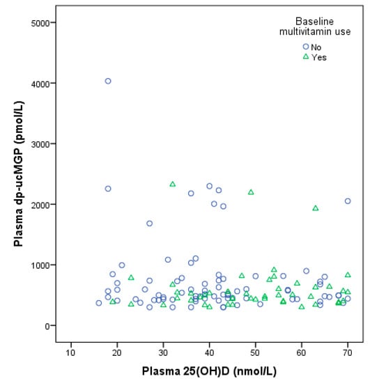 Baseline scatter plot of plasma 25-hydroxvitamin D and plasma dp-ucMGP concentrations by multivitamin use. Rounds: No multivitamin, n = 81; triangles: Multivitamin use, n = 50.