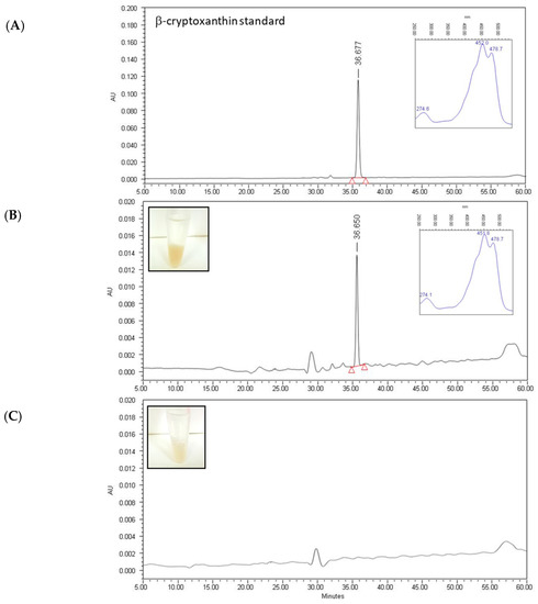 (A) BCX uptake by C. elegans. HPLC-PAD (High Performance Liquid Chromatography-Photodiode Array Detector) chromatograms of BCX (β-Cryptoxanthin) standard; (B) pellet extract from worms previously fed with BCX at 1 µg/mL; and (C) from worms grown under control condition (NGM (Nematode growth medium) without supplementation). Insert plots in (A,B) show the absorbance spectrum of the carotenoid peak identified in the chromatograms. Insert images in (B,C) show the corresponding worm pellets before disruption showing the differences in coloration. AU, arbitrary absorbance units.