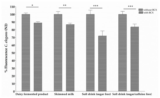 Finally, the activity on C. elegans fat-reduction was evaluated in different food matrices supplemented with BCX. Different volumes of each matrix were added to the NGM plates in order to obtain a final dose of 0.025 µg/mL of BCX: dairy fermented product (250 µL/plate), skimmed milk (250 µL/plate), sugar-free soft drink (with or without caffeine) (100 µL/plate) or orange juice (50 µL/plate).