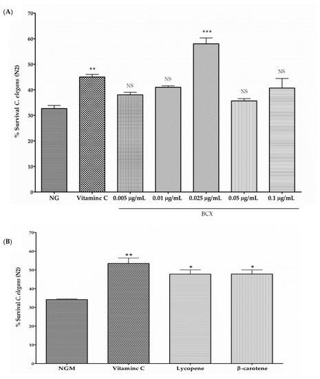 Percentage of C. elegans worm’s survival after an acute oxidative stress with 2 mM of H2O2. Vitamin C (0.1 µg/mL) was used as positive control. (A) Worms were fed at different concentrations of commercial β-Cryptoxanthin (BCX). Survival values correspond with the mean of three independent experiments; (B) Antioxidant activity of C. elegans fed with carotenoids lycopene and β-carotene at the dose of 0.025 µg/mL. In both experiments, Vitamin C (0.1 µg/mL) was used as antioxidant positive control. Survival values correspond with the mean of at least two independent experiments. *** p-value ≤ 0.001, ** p-value ≤ 0.01, * p-value ≤ 0.05, NS: not significant. NGM: nematode growth medium.