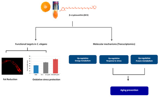 Caenorhabditis elegans is a well-studied biological system and is considered an excellent model to study many health-related diseases, such as obesity and aging [37,65,66]. Moreover, other advantages of this model are that many of the pathways related to energy, lipid metabolism, and fat storage are conserved with humans [36]. Several researchers have used C. elegans to evaluate different ingredients with anti-obesity and antioxidant properties and to explore their mechanisms of action [40,42,45,67]. In the present study, we have used this nematode to investigate the anti-obesity and antioxidant effects of BCX (Figure 1 and Figure 5) and also to dissect the molecular responses caused by BCX intake in the nematode (Figure 6, Table 2 and Table 3). Our study demonstrates that BCX exhibits fat-reducing effect and protects nematodes from acute oxidative stress. Furthermore, BCX displays higher functional activity than other carotenoids as lycopene and β-carotene. This stronger effect of BCX has been previously postulated by other authors, specifically in relation with the improvement of inflammatory markers protecting against rheumatoid arthritis [20,68]. It can be speculated that the differential functional activity among carotenoids may be due to different bioassimilation or uptake. Analysis of carotenoids from worms fed with NGM media supplemented with BCX confirmed the BCX was uptake by the nematodes (Figure 2). The bioassimilation of other carotenoids by C. elegans was also demonstrated in feeding experiments with citrus pulp, where the presence of the β,β-xanthophyll violaxanthin, the main carotenoid in sweet orange pulp, was identified in worm pellets [47]. These results suggest that carotenoids are bioassimilated by C. elegans when added to the culture media either as a single ingredient or in a food matrix (Figure 2).