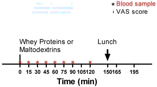 In separate days, with a wash-out period of at least 7 days, in agreement with a randomized order and cross-over design, starting from 8:00 a.m., the participants underwent two tests consisting of the oral administration, after 12 h of overnight fasting, of a drink containing whey proteins (45 g of Enervit Gymline Muscle 100% whey protein isolate cacao, Enervit spa, Erba, Italy, corresponding to 715 kj) or maltodextrin (43 g of Enervit Maltodestrine Sport, Enervit spa, Erba, Italy, corresponding to 715 kj), dissolved in 300 mL of semi-skimmed milk, corresponding to 585 kj, for a total of 1300 kj of metabolizable energy (ME). The drink was consumed within 15 min (100 mL every 5 min for three times). Each drink was prepared with the same color and taste (by using cacao powder) in order to avoid possible visual and taste conditioning. Blood samples were drawn from all participants starting from T0 (baseline, before administering the drink) until to T120, for a total of 7 samples, i.e., T0 (0 min), T15 (15 min), T30 (30 min), T45 (45 min), T60 (60 min), T90 (90 min), and T120 (120 min). By using a visual analogue scale (VAS), appetite (satiety and hunger) was evaluated at the following times: T0 (0 min), T15 (15 min), T30 (30 min), T45 (45 min), T60 (60 min), T75 (75 min), T90 (90 min), T105 (105 min), and T120 (120 min). In particular, subjects were asked to rate their satiety and hunger on a 10-cm line with labels at the extremities indicating the most negative and the most positive ratings.