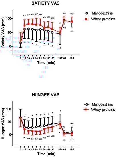 Changes of VAS (visual analogic scale) ratings of satiety (top) and hunger (bottom) in young obese subjects after the intake of a drink (completely within 15 min starting at T0), containing whey proteins or maltodextrins. At T150, a mixed lunch was offered and was completely consumed within 15 min. See the text for further details. Values are expressed as mean ± SD. The number of subjects was 9. * p < 0.05 vs. the corresponding T0 value; × p < 0.05 vs. the corresponding value of the maltodextrins-treated group; and ○ p < 0.05 vs. the corresponding T150 value. A two-way ANOVA with repeated measures (with the two factors time and group and the interaction time × group), followed by the post hoc Tukey’s test, was used.
