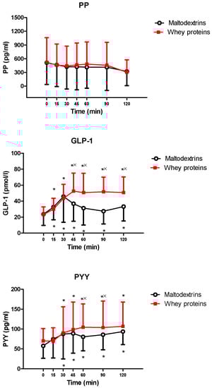 Changes of pancreatic polypeptide (PP) (top), glucagon-like peptide 1 (GLP-1) (middle), and peptide YY (PYY) (bottom) levels in young obese subjects after the intake of a drink (completely within 15 min starting at T0), containing whey proteins or maltodextrins. See the text for further details. Values are expressed as mean ± SD. The number of subjects was 9. * p < 0.05 vs. the corresponding T0 value; and × p < 0.05 vs. the corresponding value of the maltodextrins-treated group. A two-way ANOVA with repeated measures (with the two factors, time and group, and the interaction time × group), followed by the post hoc Tukey’s test, was used.