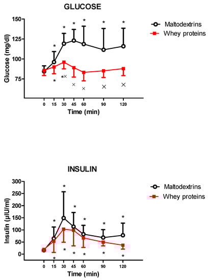 Changes of glucose (top) and insulin (bottom) levels in young obese subjects after the intake of a drink (completely within 15 min and starting at T0), containing whey proteins or maltodextrins. See the text for further details. Values are expressed as mean ± SD. The number of subjects was 9. * p < 0.05 vs. the corresponding T0 value; and × p < 0.05 vs. the corresponding value of the maltodextrins-treated group. A two-way ANOVA with repeated measures (with the two factors, time and group, and the interaction time × group), followed by the post hoc Tukey’s test, was used.