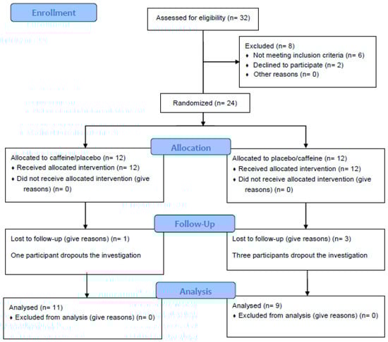 - Saunders, B.; de Oliveira, L.F.; da Silva, R.P.; de Salles Painelli, V.; Gonçalves, L.S.; Yamaguchi, G.; Mutti, T.; Maciel, E.; Roschel, H.; Artioli, G.G.; et al. Placebo in sports nutrition: A proof-of-principle study involving caffeine supplementation. Scand. J. Med. Sci. Sports 2017, 27, 1240–1247. [Google Scholar] [CrossRef] [PubMed]