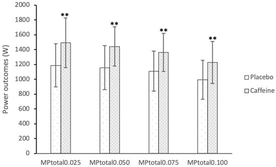 | Variable | Placebo (M ± SD) | Caffeine (M ± SD) | Mean Differences (%) | ES | p |