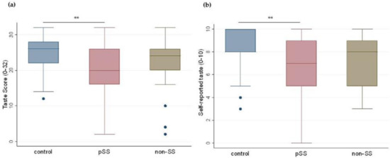 Measured and self-reported taste score in the three groups. Boxplots illustrating (a) measured taste scores and (b) participants’ self-reported taste score in controls, primary Sjögren’s patients (pSS), and non-Sjögren’s sicca patients (non-SS). (Kruskal–Wallis ANOVA and Mann–Whitney U test; ** p < 0.01.). Dots in the figures represent the outliers.