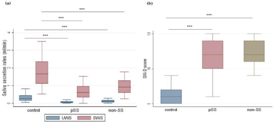 Measured saliva secretory rate and self-reported perception of xerostomia in the three groups. Boxplots illustrate median, IQRs, and ranges of (a) saliva secretion rates (mL/min) and (b) SXI-D: Summated Xerostomia Inventory-Dutch scores in controls, primary Sjögren’s patients (pSS), and non-Sjögren’s sicca patients (non-SS). (Kruskal–Wallis ANOVA and Mann–Whitney U test; *** p < 0.001.)
