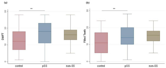 DMFT and FT results from the three groups. Boxplots illustrate median, IQRs, and ranges of (a) DMFT: decayed, missing, and filled tooth surfaces and (b) FT: filled teeth in controls, primary Sjögren’s patients (pSS), and non-Sjögren’s sicca patients (non-SS). (Kruskal–Wallis ANOVA and Mann–Whitney U test; ** p < 0.01.)
