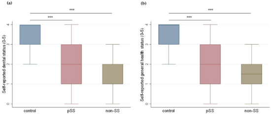 Self-reported dental and general health status in the three groups. Boxplots illustrate median, IQRs, and ranges of (a) self-reported dental status (0–5) and (b) self-reported general health status (0–5) in controls, primary Sjögren’s patients (pSS), and non-Sjögren’s sicca patients (non-SS). (Kruskal–Wallis ANOVA and Mann–Whitney U test; *** p < 0.001.)