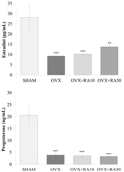 Effect of rosmarinic acid on the serum concentration of estradiol and progesterone in ovariectomized rats. Rosmarinic acid at doses of 10 mg/kg (OVX + RA10) and 50 mg/kg (OVX + RA50) was administered orally to ovariectomized rats, once daily for 28 days. SHAM: sham-operated control rats; OVX: ovariectomized control rats. Results are presented as the mean ± SEM. One-way ANOVA followed by Fisher’s LSD test were used for evaluation of the significance of the results. ** p < 0.01, *** p < 0.001: significantly different from the SHAM control rats.