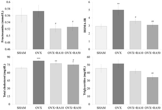 Effects of rosmarinic acid on the selected serum parameters related to glucose and lipid metabolism in ovariectomized rats. Rosmarinic acid at doses of 10 mg/kg (OVX + RA10) and 50 mg/kg (OVX + RA50) was administered orally to ovariectomized rats, once daily for 28 days. SHAM: sham-operated control rats; OVX: ovariectomized control rats; HOMA-IR: homeostasis model assessment of insulin resistance. Results are presented as the mean ± SEM. One-way ANOVA followed by Fisher’s LSD test were used for evaluation of the significance of the results. * p < 0.05, ** p < 0.01, *** p < 0.001: significantly different from the SHAM control rats. # p < 0.05, ## p < 0.01: significantly different from the OVX control rats.