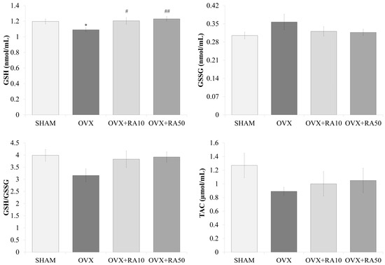 Effect of rosmarinic acid on the serum concentrations of reduced glutathione (GSH), oxidized glutathione (GSSG), GSH/GSSG ratio and total antioxidant capacity (TAC). Rosmarinic acid at doses of 10 mg/kg (OVX + RA10) and 50 mg/kg (OVX + RA50) was administered orally to rats once daily for 28 days. SHAM: sham-operated control rats; OVX: ovariectomized control rats. Results are presented as the mean ± SEM. The level of TAC is presented in Trolox equivalents. One-way ANOVA followed by Fisher’s LSD test were used for evaluation of the significance of the results. * p < 0.05: significantly different from the SHAM control rats. # p < 0.05, ## p < 0.01 – significantly different from the OVX control rats.