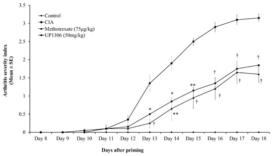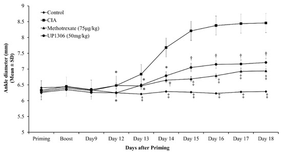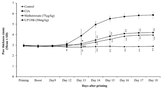| Paw thickness | 17.13 ± 0.02 † | 30.41 ± 0.85 | 21.17 ± 0.36 ** | 22.30 ± 0.43 * |